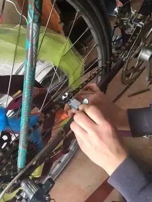 Opps! The chain that we have is too long! Kelsey Summers cut the chain down to size and connected it back together by using one of the excess rivets (from the chain links removed).