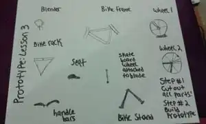 Bike power class lesson plan on prototyping. Students cut out all pieces and glue on a paper together to create a bike blender machine.