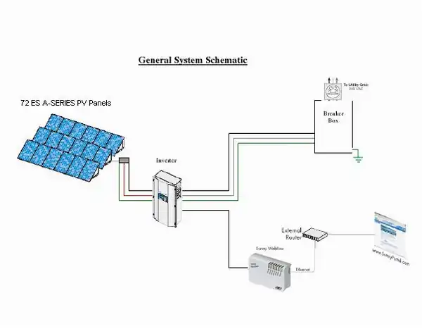 The 10.5 KW photovoltaic system is composed of 72 solar panels, an inverter, a breaker box, and an output monitoring system. Figure 2, below, depicts these components schematically.[2]