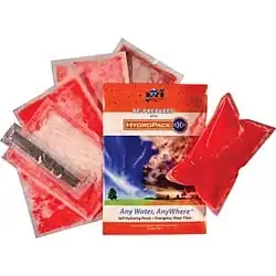 The HydroPack is a 12 fl. oz. (355 ml) pouch that can be placed into a water source where it can self-hydrate. Once it is hydrated, the user punctures it with a straw and can drink. Conveniently, the pouches can be left overnight to hydrate.