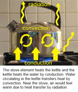 - Conduction occurs when energy is transfered by collision of molecules. This can be the flow of heat from a hot part of the body to another part that is cooler. It can also be transfered through two bodies, as long as they are touching and they have a temperature difference. For example it is like a pot of water on a stove. The stove is hot and it is conducting energy to the side of the pot that is touching it. Conduction occurs within solid materials (for example, the outside of a metal pipe containing steam or hot water feels hot because heat energy is conducted through the solid metal.) Conduction can be visualized as being like the way water soaks into a sponge.