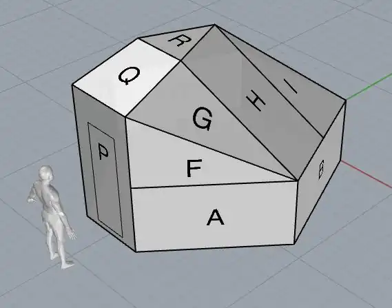 In concept it is similar to the H13, but with the advantage of greater stability, as the door is cut from a single, vertical 4' x 8' panel, which can be backed with plywood. The name comes from the fact that the footprint is kind of halfway between a pentayurt and a hexayurt: it has five horizontal 4' x 8' panels, and one vertical panel. The rest of the geometry naturally fills in the space above this basic skeleton.
