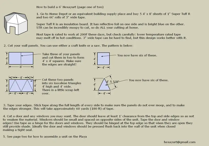 The schematics below describe the smaller 6' hexayurts. The larger, and now more commonly used designs are compared here, with links to instructions.