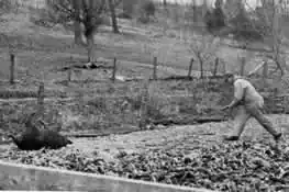 To butcher you must have the proper utensils. It doesn't take the big fancy machinery you see in the meat department of the grocery store. The first thing to get are several sharp butcher knives which are used for both scraping the hog and cutting up the meat. You'll need a sharp ax to chop the bony pieces. Next you'll need a 55 gallon metal drum or similar container. About ten feet directly above the barrel you need a pulley tied in a tree to raise and lower the hog from the barrel. Several feet of rope will be needed for the pulley in order to hang the hog and secure it to the tractor at the other end. Naturally a table will be needed to lay the cleaned hog on to cut it up. An impromptu table of saw horses and boards works very well. A wash tub or an extra large bucket will be needed to put the intestines in. At least two pans or buckets will be needed to put the scraps of meat in to be used for lard or sausage. Last is a kettle for rendering lard and another pan large enough to hold the hog's head.