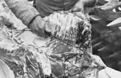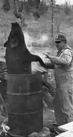 The barrel should be set under a strong tree limb. This is so the pulley can be put overhead to raise and lower the hog from the barrel. Because a small fire must be built Under the barrel it must be set about six inches off the ground. You can do this by simply setting it on some flat rocks, leaving enough room to set a fire underneath. Fill the barrel about one half full of water and begin to heat it. Set all your utensils near the barrel, especially the table which should be only a few feet away. This is so you can swing the cleaned carcass over to the table and lay it on it to cut up.