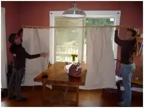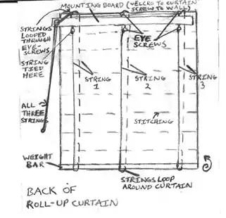 Roll-up curtains can be really easy or slightly difficult, depending on the method you choose. The curtain needs to be attached to a 1x2 mounting board with either a staple gun or with Velcro (Velcro allows removal for periodic cleaning). The easy way to install this design is to screw a small hook into the wall above the mounting board, and attach a loop of material to the back of the curtain (at the top center). In order to put the curtains up, you just roll them up by hand and put the loop over the hook to hold the curtain in place. The other method is nice looking and easier to pull up, although somewhat harder to install. First screw 2-3 eye-screws into the top of the mounting board and 2-3 into the bottom. Then screw a curtain pulley into the board on one side. Tie individual strings to each of the lower eye-screws. These strings wrap around the bottom of the curtain, up the front, and then through the eye-screws at the top of the mounting board. From there, they are fed through the curtain pulley. It is important to measure all of the strings with the curtain down. The curtain can now be pulled up with a pull of the strings. Wrapping the string around a curtain cleat on the wall holds up the curtain.