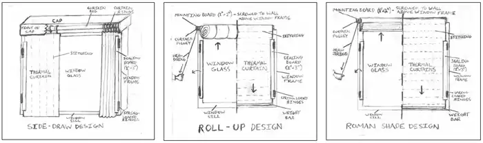 If you would prefer a different display of how to make thermal curtains, the following diagrams also are helpful. This can be done using one of three designs: side draw, roll-up or Roman shade.