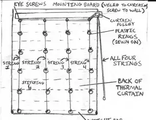 For overall convenience, relevant information from different visual and procedural methods to building your own thermal curtains have been integrated to one page. The texts have been written by different people at different times but all with the similar objective of providing easy-to-follow directions to minimize your heat loss, save you in heating costs and give you a wonderful appropriate-technology project. The more detailed procedure, found below, will provide extended benefit for those who learn better with diagrams than with the following photos and descriptors.
