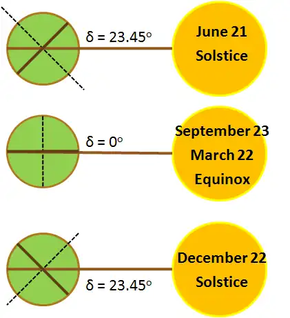 δ = 23.45 sin[ 360 (284 + n) / 365 ] where n is day of the year |