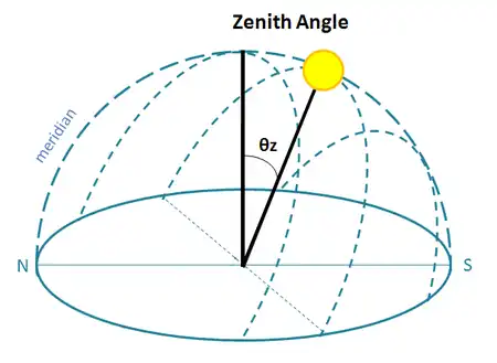 | Zenith Angle (θz) | The angle between the vertical and the line to the sun. This is also the angle of incidence on a horizontal surface for beam radiation. Additionally, the Solar Altitude angle is defined as the compliment of the zenith angle. | |