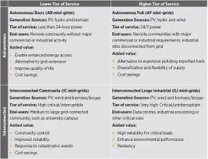 From the International Renewable Energy Agency (IRENA): Renewable mini-grids "There are four different mini-grid types. These are: autonomous basic (AB mini-grids) for lower tier of service, autonomous full (AF mini-grids) for higher tier of service, interconnected community (IC mini-grids) and interconnected large industrial (ILI mini-grids)."