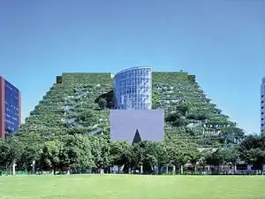 The ACROS Fukuoka building in Fukuoka City in Japan is an amazing office building with two very distinct sides: one side looks like a conventional office building with glass walls, but on the other side there is a huge terraced roof that merges with a park. The garden terraces, which reach up to about 60 meters above the ground, contain some 35,000 plants representing 76 species. A huge semicircular atrium and the triangular lobby provide contrast to the greenery, in this space is a symphony hall, offices and shops.