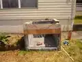 We have designed a one bin compost system with a lid in order to facilitate a hot fast composting process. The material is added to the bin and is static until the compost is ready. The first step was too wrap the pallets in a wire mesh using staples to hold in the material, keep out pests, and improve air flow. Then the pallets were placed upright and screwed together with brackets to a bottom pallet. We then sheeted out the plywood and wrapped it around the pallets. All the plywood was water treated and primed. Support blocks were put behind the plywood to hold the wood in place. We designed the bin to receive extra light and heat by having a clear Plexiglas lid. To improve the airflow of the bin we drilled four holes on each side of the bin. The front of the bin was designed to allow for the user to have enough room to shovel the compost without it being to tight. The top half of the front is plywood which supports a baffle which will hopefully keep materials away from the door making collection easier. The door was installed using hinges and includes an eye hook with a carabiner and chain to keep it up while in use. The lid was installed using hinges and can be supported up with a piece of wood. The plexiglass lid is framed in wood giving it support and durability.