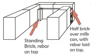 Place a bed of mortar over the milk can and lay a half brick on top of it. Stand a brick against the opposite wall and rest two 22" pieces of rebar on top of the prick so that they bridge the width of the stove. The standing brick should be cut so that the rebar pieces lay level.