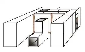 Over the 5"x5" hole left towards the rear of the stove, build a brick tower to lift the chimney, as indicated in the drawing. Next, seal the front wall of the stove to create teh cavity which will hold the insulation. The entire structure should be solid, leveled and square.