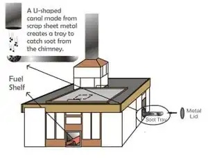 Build a 20" long, U-shaped sheet metal tray to catch wood ash falling from chimney - insert through can.