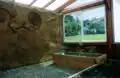 The first layer of stucco is a clay slip. This is made of clay that has been put through a screen, soaked in water, and blended into a creamy texture. When we had 50 gallons made we rented a plaster sprayer to apply the mixture onto the walls. If we did not have this sprayer we would have had to apply it by hand which would have taken a long time and we could have never gotten it to penetrate the walls deep enough. The purpose of the clay slip is to create a surface to which the rest of the stucco can bind to.(Fig 21) To mix the second layer, which is called the scratch layer, we rented a cement mixer. This layer is a combination of sand, clay, and straw and is the consistence of brownie mix.(Fig 22) We applied the scratch layer to the bales after the slip had dried a little. This is a thin layer put on by hand into which we made horizontal lines with our fingers so that the next layer would sick to it. When applying the scratch layer it is best to start on the bottom of the wall and work your way up pushing the mixture in an upward direction.(Fig 23) The third layer or filler layer was mixed with our feet on top of tarps. This layer is made up of the same materials as the scratch layer but the proportions are a little different. There is less clay, less water, and the pieces of straw are longer.(Fig 24) As with the last layer it is important to work in an upward direction so that each piece of stucco is bonded with the one below it. We would mix up a small amount of filler and break it into small hand sized balls that we applied one at a time dampening the wall before sticking them on. There are a couple of reasons why it is important to dampen the layer underneath before adding new material on top. One is to help the new stuff stick and two so that the layer beneath it does not suck out the moisture from the one on top and cause cracking. With this layer you can take out all the impurities of the wall. If there is a little hole you just fill it, hence the name filler layer. The application of this layer was extremely time consuming and took approximately 120 hours by itself.(Fig 25&26) Once the filler layer was complete it was time to do any artwork that we wanted on the walls. The artwork is done with the same mix as the filler layer and is like working with clay in ceramics class. It is important to make your designs much bolder than you want your finished product to be so when you add the last coat of stucco the detail is not lost.(Fig 27&28) The preparation of the materials for the last coat took a long time. The last coat is made up of horse manure, clay, sand, and flour paste, all of which had to be processed. The sand was run through a 1/8 inch screen(Fig 28), the manure was pushed through a ΒΌ inch screen(Fig 29) and the clay needed to be blended into the same creamy consistency as the slip. Fortunately, we had some help with this process from a class at the local university. Once the materials were ready we mixed them like the last layer, on a tarp with our feet, and applied it to the wall by hand. This layer did not have the right ratios and had to be redone later due to cracking. The lesson we learned here is to make sure that your test strips are right and you have the proportions correct.(Fig 30&31) This is our test strip bale. In the future I will make all of my test strips about twice as big as what I did here so that I get a better feel of how it will look when it dries.(Fig 32) The mistake in our plaster turned out to be not enough sand or horse manure. Our final ratio was two parts sand and horse manure to one part clay and lots of water to make it go on easy with a trowel.(Fig 33)