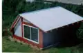 After the roof and glass were up we put on the roof cap and siding. Some of the siding was 4'x8' sheets of exterior plywood called T1-11 but we also used some of the roofing material on the east side to let more light in. Once the siding was up we stained that as well.(Fig 13)