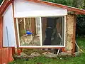 The first window we put in the greenhouse is the one on the east side.(Fig 9) This window lets in a lot of morning sun and helps take the night time chill off. All of the windows are second hand and recycled that we bought locally. A problem we had with the first window is that it is made to go vertical not horizontal, the way we installed it. Because of this there are springs in the window to help it go up and in this case, being on its side, the springs help it open but it is very hard to close. To fix this we removed the springs and now it slides easily in both directions. Another problem we discovered is that the drains for the window are now on the side instead of the bottom where they are supposed to be. This has lead to a leak right in the center of the window which could eventually lead to rot. On the south side we installed two long windows on the bottom. These will not let in much light but they will let in a little and are mostly for aesthetics.(Fig 10)