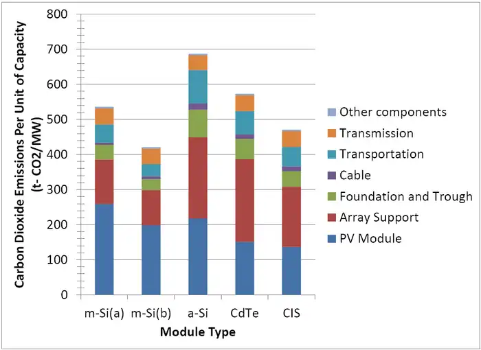 Lifecycle carbon dioxide emissions refer to the emissions caused by the production, transportation, or installation of materials related to photovoltaic systems. In addition to the modules themselves, the typical installation includes electrical cable and a metal rack. Ground-mounted photovoltaic systems also include a concrete foundation. Remote installations may require additional infrastructure for transmission of electricity to the local electrical grid. In addition to materials, a life cycle analysis should include carbon dioxide emitted from vehicles during the transportation of photovoltaic modules between the factory, the warehouse, and the installation site. Figure 4 compares the relative contributions of these factors to the lifetime carbon dioxide impacts of five types of photovoltaic modules.[5]