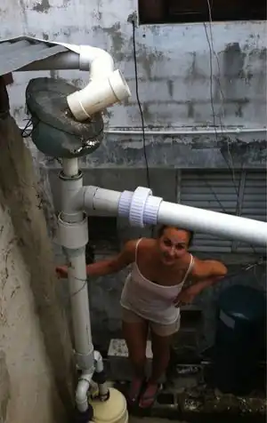 The director of the school in La Yuca wanted to have potable water in the bathroom and a direct faucet to the cistern. Taking into consideration the director's desires, the final design was constructed to have potable water in the shower sink and greywater use for the toilet.