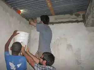 | First window: On to opposing sides of the room there were large open spaces where rain would enter the room when it rained. To cover these holes while still allowing for some ventilation we used Styrofoam and cement to create windows with spaces left in them slanted so that air may pass through them, but water may not. | ![]() ![]() |