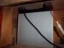 The battery station is located in a wooden box mounted in the classroom near the entrance. It contains the relay, shunt, charge controller, and battery.