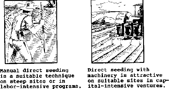 Direct seeding is an increasingly favored approach to the establishment of leucaena wood plantations. The success of direct seeding hinges on timing, land preparation, and weed management. The primary advantage of direct seeding over transplanting is the elimination of nursery operations, resulting in substantial cost savings. The major constraint is the need for intensive weed management during the early months after establishment. Although a greater level of management is implied in direct seeding, effective establishment has been achieved by planting leucaena seeds in the same manner as row crops (notably corn) with which small farmers are most familiar.
