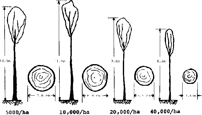 Diameter and height development of leucaena is influenced by per hectare populations (Figure 5.3). Generally, diameter growth is affected more by high populations than height growth. Thus, spacing is an effective management tool which when considered in conjunction with rotation age can be used by the manager to produce material of suitable diameter and length for many different purposes.