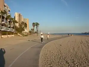 - Long Beach, Bike paths: The City of Long Beach's vision is to be the most bicycle-friendly urban city in the nation. The City of Long Beach has five major Class 1 bike paths (separate off road bike paths) within its boundaries, encompassing over 60 miles (97 km). The City also has many Class 2 (painted lanes on roadway) and Class 3 paths (connecting bike routes with shared use of road with cars). The 3.1-mile (5.0 km) Shoreline Pedestrian Bikepath runs along the ocean from Shoreline Village to Belmont Shore. The southern terminus of the L.A. River bicycle path is located in southwest Long Beach between Downtown and the Port. The southern terminus of the San Gabriel River bicycle path is located just east of Long Beach in Seal Beach, and the trail runs north through the El Dorado Park neighborhood in east Long Beach and adjacent to El Dorado Regional Park.