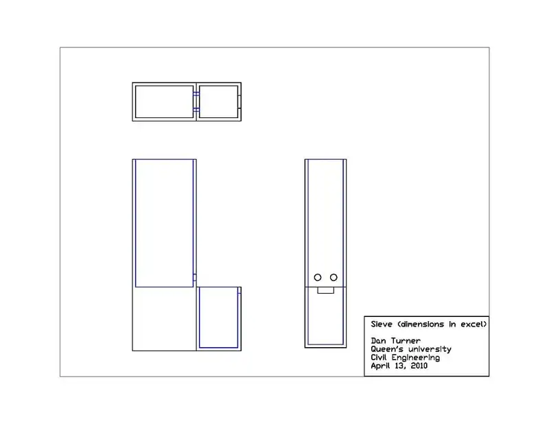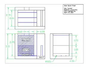 Filter material must have a nominal diameter that corresponds to an adequate hydraulic conductivity. If a sand with a small enough diameter is not available for the filter, a sieve may be used to separate the smaller particles and create an adequate filter material. In areas where standard sieves are not available, a sieve apparatus similar to the settling basin design could be used to separate the smaller particles. The settling velocity of a particle is proportional to the particle diameter and the flow rate across the settling basin. By controlling this rate with basin dimensions and a constant head reservoir, all particles greater than a given diameter will be settled in the basin and smaller particles will remain in the effluent. By removing larger particles in previous basins, particles settled in subsequent sieves will be an adequate size for the filter material. By maintaining a constant head with water that has suspended sand particles, the basin will collect the design diameter which can be collected and used in for the filter material. The sieve design parameters are outlined in the excel file and design drawings are provided.