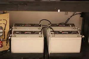 The batteries used for the project are sealed used in deep cycle applications and rated for 140 Amp hours. They are wired in series parallel to produce a capacity of 24Volts and 280 Amp hours. The terminals are connected together using 3 gauge wires with crimped lugs and bolt that attach to the battery. The positive and negative leads to the controller are taken from opposite corners of the bank to ensure that the energy flows through all cells equally to increase battery life. Each battery weighs approximately 120 pounds and must be situated on the cart so it is balanced evenly.