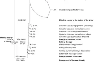 When modeling a photovoltaic system there are many losses which have to be taken into account other those relating to weather. There is a certain amount of unused energy that is simply unused due to over sizing the system. The two Shuco solar modules provide approximately 44% more power than what the batteries are able to store. Smaller modules or less battery storage could have been implemented to reduce waste however due to materials costs and system voltage. The two panels were needed to ensure power production for the year and batteries were selected based on price and capacity. For losses which occur in a system which exclude weather contributions, see Figure 6.