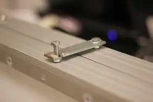 The finished cart can be seen in Figures 7 & 8. To attach the panels, one of the panels was fitted with 3/8" steel flat bar on the inside of the frame for reinforcement (see Figure 9,) to prevent the frame from twisting and possibly shattering the glass while adjusting. Then they were riveted together with piano hinge, so the PV of the panels were facing each other. A beam of unistrut was fit inside the steel reinforced panel, and held in place with four brackets. Four hinges connect the unistrut and panels to the body of the cart.The top panel (the reinforced one connected to the cart) has two square steel tubes attached to the bottom corner of it(see Figure 10.) At the other end of each steel tube is a thick 4" bolt (see Figure 11.) There are three holes at the base of either side of the cart that the bolts easily slide into (see Figure 12.) The holes were drilled out to hold the panels at 0°, 20°, or 30°. There are two legs attached by "L" brackets to the underneath of the other panel's frame (see Figure 13.) The legs were constructed of three pieces of slotted angle bar so they could be adjusted to different heights for the different angle settings. They automatically drop down when the panels are unfolded.