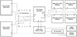 Two 220W solar panels were donated by Queens University for the project, therefor the power circuit was designed around them. PV power modelling software was used to possibly reduce the number of panels needed to only one. But that was not a viable solution for the power objectives. 2 DC power supplies are required: