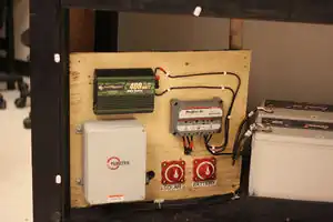 The inverter selected was a Powerbright pure sine wave (MSW) DC/AC converter with two 120Volt receptacles rated for 15 amps each. The inverter is capable of operating either on a 12 or 24 volt system. A fan and heat sink is used to cool the sensitive equipment so it must be mounted in a position which allows for ventilation. There is a built in 40Amp car fuse which is used to protect the inverter in case a surge may occur. The converter is capable of running many small products such as laptops, cell phones, a number of stepper motors, DVD players etc. It should only be operated in conditions ranging between -20°C and 40°C but works best between 15°C and 20°C. There are three plugs including the laptop, printer and printer heat bed, that need to be plugged in which requires a power bar stationed on the cart. Caution will be used not to exceed the converter's maximum output amperage rating. When there is no sun supplying power to the controller, batteries must be used in order to continue operation.