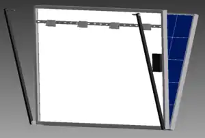 Once the batteries are on the cart, the panels can be put on. The first is to reinforce the top panel with steel flat bar. use two full length 'L' brackets in the bottom corners, and the two shortened brackets in the top corner, with the short ends pointing downward, see figure 20. Measure the height of the cart from the top of the wheel to the top of the cart. Measure that distance from the bottom of the top panel upward, adding an extra 1/2" for clearance. That will mark the top of where the unistrut support bar goes. Connect the four heavy duty hinges to the unistrut as in figure 20, making sure the distance between the outer two hinges is just less than the length of the cart.