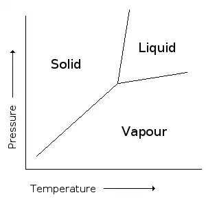 Within the effusion cells, the major process driving flux generation is the solid-vapour phase equilibrium. A general phase diagram for a single component system is shown to the right. The pressure at which the MBE process is undertaken is below the triple point (where the three lines meet), and thus the only phases present at equilibrium are solid and vapour. Equilibrium is met at normal operating conditions if the effusion cell is properly designed. Gibb's phase law states