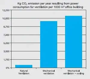 However, money is not the only thing that is saved. With sustainability in mind, natural ventilation becomes a very attractive option for reducing emissions. Figure 7 below compares the amount of CO2 released into the atmosphere for natural systems vs. mechanical systems.