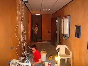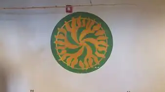 Students at Cal Poly Humboldt use egg paint to create this logo for the interior wall of the Campus Center for Appropriate Technology.[12]