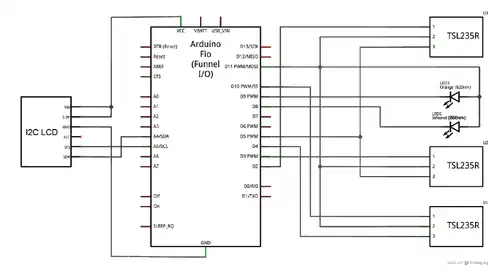 Connect the two LEDs, the LCD and the sensors to the Arduino Fio as shown in the schematic. Upload the firmware code to the Arduino and test whether everything is working correct. Important: to compile the firmware, you need the LcdMenu and DuplexFrequencyCounter libraries from another repository.