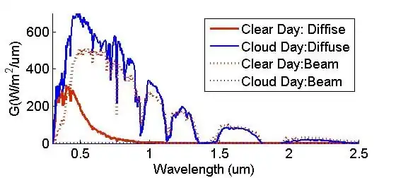 It should be noted at this point, however, that the assumption of AM1.5 spectra is not a valid one for the majority of atmospheric conditions, and the spectrum can vary widely over the day and year as atmospheric constituents and solar geometry changes. As an example of this, two days are shown below, which both contain 400W/m2 of broadband irradiation. One is a clear, sunny day at high air mass, and the other is a cloudy day at low air mass.