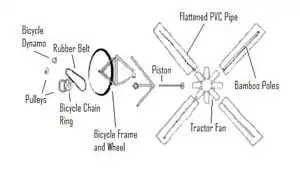 William was able to build his windmill based on the schematic shown below.[6] It was then mounted on a large tower he created out of wood. Overall, the machine is fairly simple in concept with the major limitations being available materials and limited access to tools. Through testing, William found that using his design, a four blade windmill was able to generate more power than its three blade counterpart.[7]