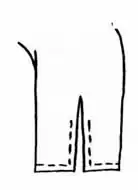 Another material used to make dolls was socks. But the socks used weren't new--they had to be worn first. No one could afford to waste a new sock, so often the heels were worn thin and the toes were all but gone. Yet these socks made fine dolls for a small child in need of a plaything. The foot of the sock became the head and body, and the top became the legs. To make these dolls, first lay the sock flat and cut the top of the sock along the folded sides to within three inches of the heel. (Ill. 2) Then open and turn the sock inside out so that the raw edges are together and stitch along the feet and up the legs with right sides together. (Ill. 3) Remember to leave a place to turn the doll right side out (usually at the crotch). Stuff the doll with cotton, rags or shredded foam and then hand sew the opening closed. Since these were just simple dolls made hurriedly and with poor materials they rarely even had arms. The head was separated from the body by tying a string tightly around the neck. The bright and shiny eyes were usually buttons and the mouths were red embroidery. Colorful yarn hair framing the faces of these dolls was often rolled into a bun or tied into pigtails. Scraps of old clothing sewn into doll clothes made up the wardrobe. Since the dresses either had no sleeves or they simply hung loosely at the sides, they had to be tight enough to stay on by themselves.