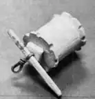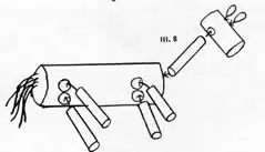 Raiding Mother's sewing box often yielded empty wooden spools from which numerous toys were made. A tractor was one easily made spool toy. These tractors rolled swiftly across the floor, yet didn't need batteries or electricity--only a rubber band. To make a spool tractor cut notches around the rims of the spool to represent lugs, and insert a rubber band the length of the spool through the hole. Secure the band at one end by sticking a short section of a match stick through the loop. For the other end, first carve a piece of hard soap slightly smaller than the spool and about 1/4 inch thick. This serves as a lubricant when the spool turns. Cut a small hole in the center and insert the rubber band through this hole. Secure the band with a match stick that extends far enough from the spool to wind up and then act as a drag to guide the tractor.
