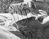 The corn husk dolls took longer to make than the cob dolls because the husks had to be softened in water first. When they became flexible enough to work with, the husks were fashioned into dolls resembling Indians or Pilgrims. To make a doll soak husks overnight. Gather five or six husks together and trim the ends. Lay the husks on top of one another with the curved ends lying the same direction. The curved ends are those that had been attached to the cob. Place two or more husks with the curve in the opposite direction. Tie close to the top edge with twine. To form the head, bend the entire length of the two groups of husks down over the twine in opposite directions. The bend must be made immediately above the twine. (Ill. 5) This forms a rounded head with a thin hole at the top. Tie a strip of folded husk around all the husks about 1" from the top to designate the neck.