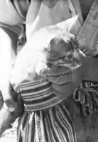 Animals were some of the best companions of farm children providing enjoyment for the entire family. Dogs accompanied children wherever they went and cats curled on warm laps at home. But the most fun of owning a cat was playing house with it. Most doll clothes were just the right size for kittens and smaller cats. These "babies" were much more fun than ordinary dolls--they were alive and moving, even if it was usually far away from the children. It was very amusing to see a furry kitten attired in a dress and bonnet. If the cat was cooperative enough the children would dress it in pants or boots. Since usually the kittens weren't overly enthusiastic about wearing these confining clothes, the children had a difficult time dressing them. Keeping the cats under control was the biggest problem faced by the "mother," for it was very upsetting when her "baby" repeatedly jumped out of its stroller.