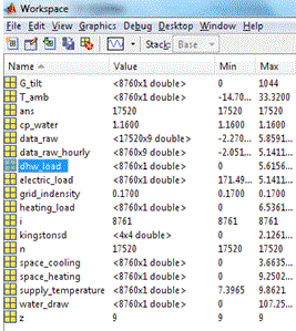 - Press the Run button or F5. If the m-file runs properly, you should now be able to load the six inputs required for each geographical location. You can test the veracity of your uploaded data by typing 'load' followed by the case study data archive name in the MATLAB command window. For the SD house in Kingston, you can type 'load kingstondatasd'. You should see 18 data arrays in your workspace (see below; some are non-essential to PVTOM). You can read the data in each data array by double-clicking on the respective icon. You should have the same arrays for every case study.The data upload process is complete when you see a plot function representing the hourly end-use energy consumption for the last case study. The blue line represents electricity, red represents space heating, green represents domestic hot water, and light blue represents space heating.