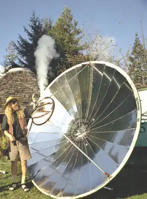 Local Solar Cooking expert and Appropriate Technology innovator Bart Orlando inspired and co-created this project. Bart offered his vision of the papasan chair solar cooker as a class project when he came to speak in front of the class at the beginning of the semester. Bart has been working with students in the Humboldt area for more than 15 years, building and designing pedal powered and solar powered prototypical educational displays. Working with Bart means that this project had the benefit of the innovative design that comes from years of experience. For more information on Bart's projects, visit these , , and Parabolic basket solar cooker web pages. Bart Orlando's main web page students wishing to start a project with him is entitled Projects With Bart.