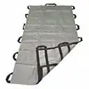 Patients who are non-ambulatory (cannot walk on their own) may be moved to the gurney in many different ways such the sit-pick maneuver or movement by draw-sheet. Both of these maneuvers are useful if the patient is in close proximity to the gurney. In the event that the patient is located in an area that is inaccessible by the gurney or the patient is large enough that a draw-sheet or sit-pick will not work, a commercial patient mover may be used. Patient movers go by many names such as Redi-Beds or Mega-Movers and are essentially reinforced tarps with many handles around the edges. Patient movers are made to be carried or dragged and are useful in moving both patients in difficult to access areas and bariatric patients. A patient may be placed on a mover by a variety of methods, but by far the most common is the log roll described above (c-spine immobilization is not needed). In this case, while the patient has been rolled to one side, half of the mover is bunched up long-ways and pushed as far under the patient as possible. The patient is then rolled to their other side which frees the part of the patient mover that was trapped under the patient. The patient is then returned to the supine position; the patient should be close to centered on the patient mover and can be carried (or dragged if necessary) to the gurney for packaging and transport.
